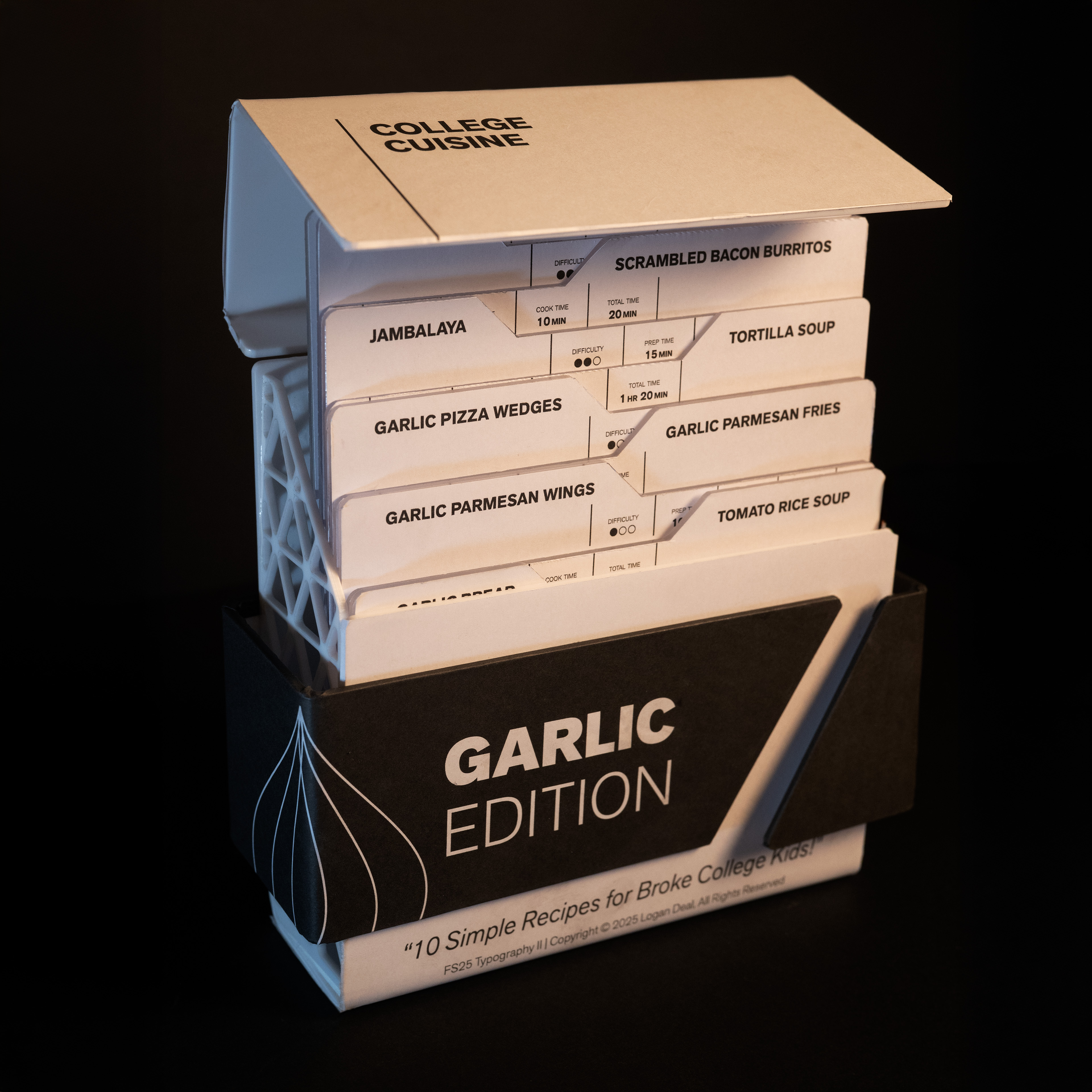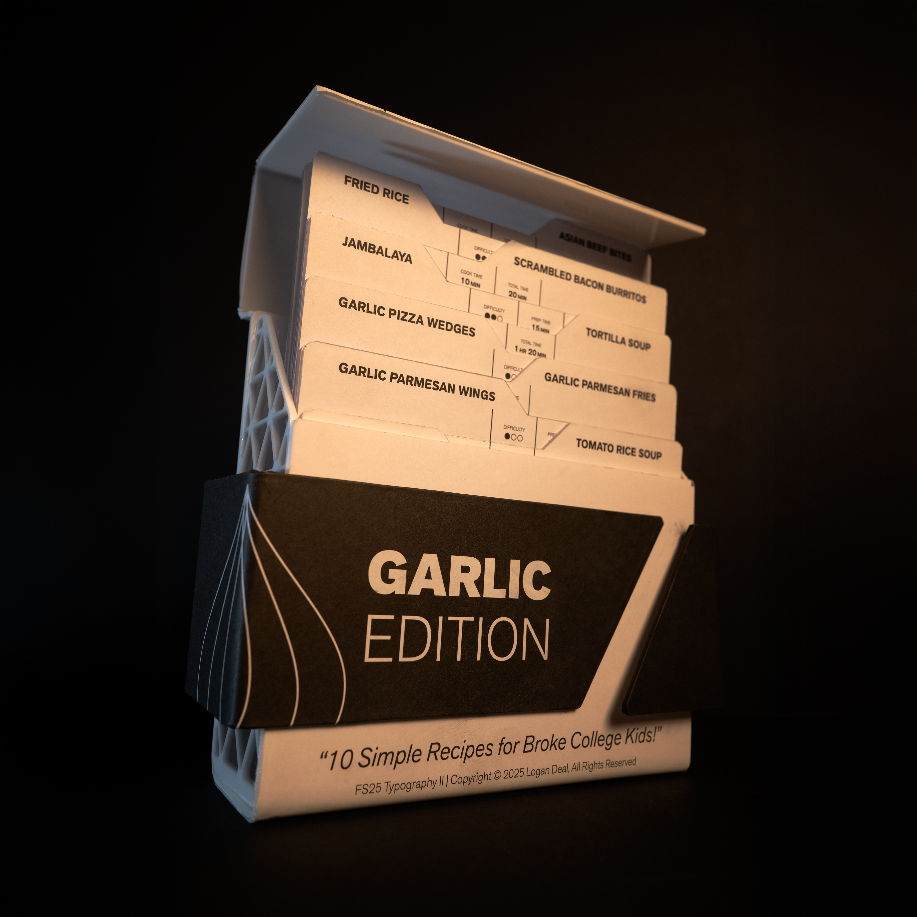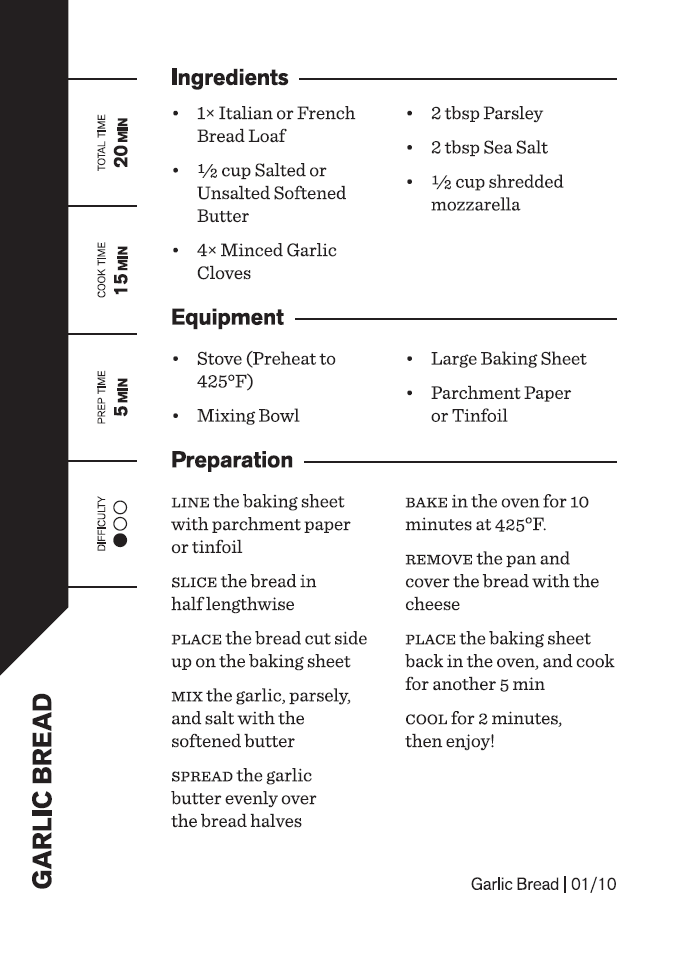 In developing my recipe cards, I identified a target demographic of college students like myself, and as such, adhered to the following hierarchy: